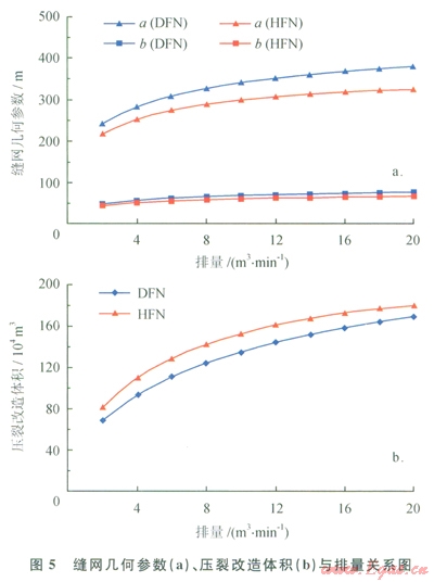 DFN模型和HFN模型計(jì)算所得縫網(wǎng)最大縫高分別為27.9m和27.2m,不隨排量的變化而變化。在其他條件相同的情況下,隨著排量的增大,a和b逐漸增大,壓裂改造體積逐漸增大;對(duì)于DFN模型,“由243m增加至380m,b由49m增大至76m,壓裂改造體積由68×104m3增大至169×104m3;對(duì)于HFN模型,以由218m增加至325m,b由44m增大至65m,壓裂改造體積由82×104m3增大至181×104m3。在相同排量下,利用DFN模型預(yù)測(cè)的縫網(wǎng)幾何參數(shù)比HFN模型預(yù)測(cè)值大(圖5-a);而利用DFN模型計(jì)算的壓裂改造體積比HFN模型計(jì)算值小(圖5-b)。