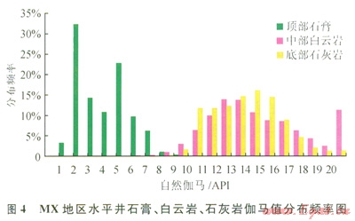 伽馬值衡量的是地層中放射性物質(zhì)含量,對(duì)儲(chǔ)層判別基本不起作用。但根據(jù)MX地區(qū)區(qū)域資料,自然伽馬能有效識(shí)別出儲(chǔ)層頂部石膏層。如圖4所示,頂部石膏的伽馬值主要集中在1~8API,而中部白云巖的伽馬值主要集中在8~20API,底部石灰?guī)r的伽馬值主要集中在9~l8API,石灰?guī)r、白云巖與石膏的差異非常明顯。可用8API作為石膏的輔助判別上限。