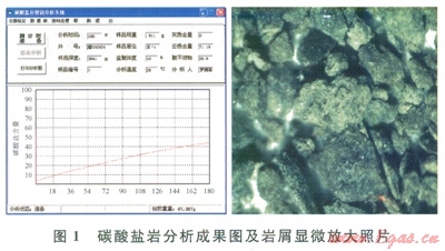 準(zhǔn)確鑒別巖屑,正確識(shí)別出地層巖性是儲(chǔ)層評(píng)價(jià)的首要條件,并可根據(jù)鑒別結(jié)果直接篩除掉非儲(chǔ)層巖性段(頂部石膏和底部石灰?guī)r)。為了準(zhǔn)確識(shí)別巖屑巖性,在利用遲到時(shí)間實(shí)測(cè)法對(duì)巖屑進(jìn)行了準(zhǔn)確歸位后,采用碳酸鹽巖分析儀對(duì)巖屑進(jìn)行逐米鑒別,并結(jié)合巖屑顯微放大掃描對(duì)巖屑巖性、顆粒及儲(chǔ)集空間特征進(jìn)行分析(圖1)。實(shí)鉆過(guò)程中,通過(guò)多種巖屑識(shí)別方法的綜合運(yùn)用,該井巖屑識(shí)別較為準(zhǔn)確并與隨鉆伽馬具有較好的對(duì)應(yīng)性。