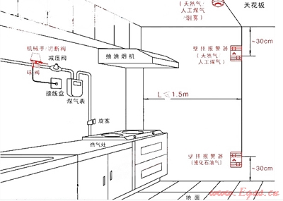 該探測器可以安裝在氣瓶輸出的瓶組間,也可以安裝在使用氣體的廚房間,如果是液化石油氣,氣體探測器安裝在離地面30公分處。(因為液化石油氣比空氣重,發(fā)生泄漏以后氣體下沉)使用天然氣就要安裝在天花板或則用氣設(shè)施的上方。探測器可以調(diào)整和設(shè)定燃?xì)鉂舛葓缶瘮?shù)值。一般可以設(shè)定在15%,一旦氣體濃度達(dá)到15%。探測器,自動輸出一個開關(guān)信號。可以控制機(jī)械手動作關(guān)閉多個進(jìn)氣閥門。同時可以控制開啟防爆排風(fēng)扇工作。通過安裝的無線發(fā)射器,控制放置在收銀臺(可以保證長期有人在場)和廚房間的語音報警器發(fā)出:“氣體發(fā)生泄漏,已經(jīng)切斷了氣源。請立即派人處理。