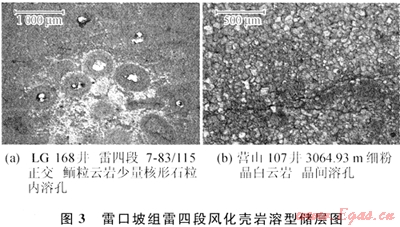 發(fā)育風(fēng)化殼巖溶型白云巖和顆粒白云巖2類儲(chǔ)層,前者見(jiàn)于盆地中部地區(qū),以LG雷四段為代表;后者發(fā)育于雷一段和雷三段,以中壩氣田最為典型[17],下面分別討論其特點(diǎn)。