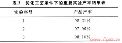 為了驗證正交實驗優(yōu)化出來的工藝條件的可靠性,在該條件下又進行了3次重復(fù)實驗,得到的產(chǎn)率結(jié)果如表3所示。