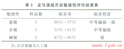 龍馬溪組頁(yè)巖的流體儲(chǔ)層敏感性為中等偏強(qiáng)強(qiáng),其中堿敏臨界pH值儀為7,損害率可達(dá)90%(表2)。儲(chǔ)層應(yīng)力敏感性系數(shù)為0.48~0.62,應(yīng)力敏感程度為中等。
