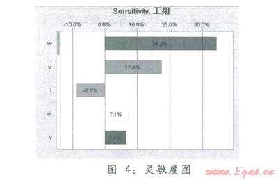 綜合以上分析,活動W、u等均以較高的概率出現(xiàn)在關(guān)鍵路徑上,同時由靈敏度圖可知兩個活動歷時和項(xiàng)目工期相互關(guān)聯(lián)系數(shù)較大,因此對于此類活動應(yīng)該高度關(guān)注。