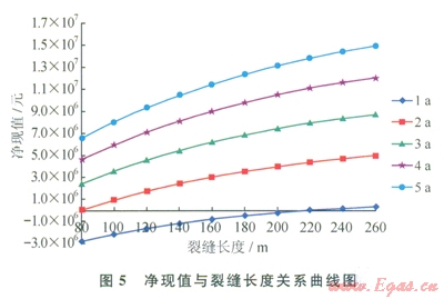 結(jié)合經(jīng)濟評價模型,通過模擬高滲透帶長度為80~260m下的產(chǎn)量,利用凈現(xiàn)值法優(yōu)選裂縫長度,凈現(xiàn)值表達(dá)式為: