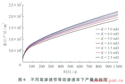 改變地質(zhì)模型中高滲透帶滲透率,模擬高滲透帶滲透率分別為2.5、3.0、3.5、4.0、5.0、6.0、7.0mD時的產(chǎn)量,分析凈現(xiàn)值與高滲透帶等效滲透率的關(guān)系,其模擬結(jié)果見圖6、7。隨著高滲透帶滲透率的增加產(chǎn)量不斷增加,當(dāng)高滲透帶等效滲透率增加到4mD后,產(chǎn)量增幅及凈現(xiàn)值曲線均趨于平穩(wěn),因此優(yōu)選的高滲透帶滲透率為4~5mD。