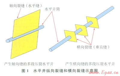 通常水平井分段壓裂裂縫存在2種極限情況:縱向和橫向(圖1)。當(dāng)水平井井筒方位與最大水平主應(yīng)力方位垂直時(shí),可產(chǎn)生橫向裂縫;當(dāng)兩者方位一致時(shí),可產(chǎn)生軸向裂縫(縱向裂縫);當(dāng)兩者夾角處于其他情況時(shí),裂縫形態(tài)會(huì)非常復(fù)雜。由于水平井軸向裂縫有效泄流面積相對(duì)橫向裂縫來說小很多,一般希望水平井壓裂產(chǎn)生橫向裂縫作為裂縫網(wǎng)絡(luò)的主裂縫。頁巖氣井最佳的壓裂效果是產(chǎn)生垂直于水平井段的橫向主裂縫的同時(shí),產(chǎn)生垂直于橫向裂縫的二級(jí)裂縫,以提高裂縫與地層的接觸面積,有利于頁巖氣的解吸附和氣體在儲(chǔ)層中的流動(dòng)。據(jù)統(tǒng)計(jì),水平井分段壓裂的裂縫以橫向裂縫為主[3-5]。