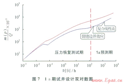 從圖7中的la預(yù)測(cè)期可以看出,壓力恢復(fù)測(cè)試期過后表現(xiàn)為裂縫邊界流和復(fù)合線性流特征,氣井生產(chǎn)1a仍然沒有出現(xiàn)系統(tǒng)徑向流和外邊界效應(yīng),同時(shí)也驗(yàn)證了測(cè)試期出現(xiàn)的線性流和徑向流分別為早期線性流和早期徑向流。