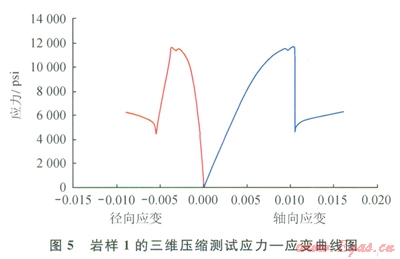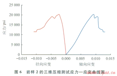 三維壓縮實驗應力 應變曲線如圖5、6所示。巖石材料的塑性與脆性可根據(jù)應力、應變曲線上負坡的坡降大小來劃分。負坡較陡者為脆性,反之為塑性。由圖5、6可知:巖樣1和巖樣2在應力分別為l2000psi(1psi=6.895kPa)和20000psi時,應變?yōu)?span lang="EN-US">0.01、0.009時破碎,屬于脆性巖石,且?guī)r樣2應力、應變曲線上的負坡較陡,故其脆性優(yōu)于巖樣1。