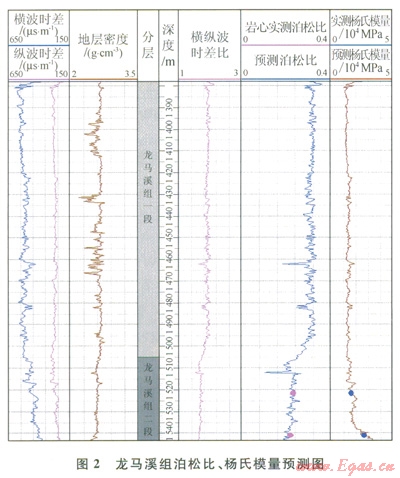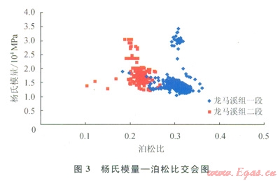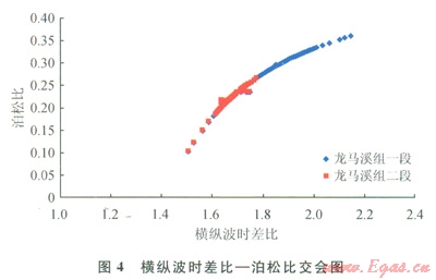 整體龍馬溪組楊氏模量介于l×104~3.5×104MPa,平均為2.3×104MPa;泊松比介于0.1~0.37,平均為0.24。通過圖3可以看出,龍馬溪組一段楊氏模量平均值為1.4×104MPa,泊松比平均值為0.3;龍馬溪組二段楊氏模量平均值為l.8×104MPa,泊松比平均值為0.23。龍馬溪組二段較龍馬溪組一段具有低泊松比,高楊氏模量,說明其脆性優(yōu)于一段。圖4為橫縱波時差比和泊松比的交會圖,可以看出龍馬溪組二段的橫縱波時差比明顯低于一段,說明低橫縱波時差比參數(shù)用于表征頁巖的脆性程度是有效的。
