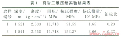 通過巖石力學實驗,龍馬溪組二段頁巖儲層基質巖石,抗壓強度分布在91~152MPa,平均抗壓強度為121.98MPa,平均楊氏模量為2.15×104MPa,平均泊松比為0.23(表1)。測試數(shù)據(jù)分析結果可知,巖樣2對比巖樣l具有低泊松比和高楊氏模量的特征,說明龍馬溪組二段在深度1541m時,頁巖脆性程度最優(yōu),與先前的礦物分析和脆性指數(shù)得到的結論相符。