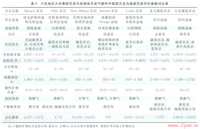 鑒于目前國內(nèi)外還沒有形成頁巖氣(油)藏的評價標準,筆者以美國Barnett頁巖和Ohio頁巖氣藏勘探經(jīng)驗為指導(dǎo)[28],結(jié)合川東地區(qū)大安寨段頁巖TOC較高、類型較好,演化程度適中、累計厚度較大、分布范圍廣而穩(wěn)定、埋藏深度適中、脆性礦物含量高和具有較好—好的烴源巖性質(zhì)等特征,與美國眾多頁巖氣盆地和中國南方頁巖氣勘探近期取得突破性進展的志留系龍馬溪組頁巖[26]各項參數(shù)進行對比(表3),同時考慮川東地區(qū)大安寨段頁巖分布而積都超過2000km2,地質(zhì)歷史中始終深埋地腹而未被剝蝕,地表條件以地形高差相對較小丘陵和中山為主,大、小江河密集分布,水資源豐富及交通便利等相關(guān)的輔要條件,對川東地區(qū)大安寨段頁巖氣(油)成藏條件和資源潛力進行綜合評價。結(jié)果認為:該地區(qū)大安寨段頁巖具備非常優(yōu)越的頁巖氣(油)成藏條件。