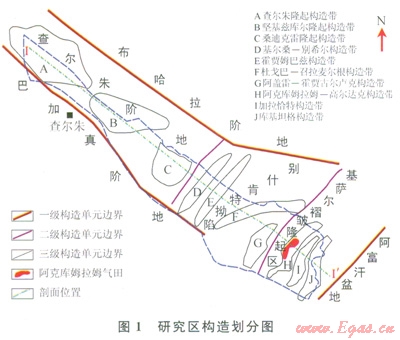 別什旨特坳陷東南部為基薩爾褶皺隆起區(qū),是阿姆河盆地的邊緣造山帶,與阿富汗—塔吉克盆地相接,呈復(fù)式背斜和復(fù)式向斜的構(gòu)造格局。隆起區(qū)具有正地貌特征,其山系海拔介于600~l000m,出露古生代基底,隆起區(qū)向盆地內(nèi)部傾沒部位則與負向地貌一致,地表出露的地層較新?;_爾隆起區(qū)可以進一步分為3個逆掩斷裂背斜帶,即阿克庫姆拉姆高爾達克構(gòu)造帶、加拉恰加特構(gòu)造帶、庫基坦格構(gòu)造帶。