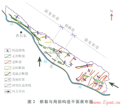 東部強變形帶指基薩爾褶皺隆起區(qū)和別什肯特坳陷,構(gòu)造以逆掩斷裂背斜構(gòu)造帶為主?;_爾褶皺隆起區(qū)構(gòu)造變形強度最大,逆掩斷裂發(fā)育(圖2),愈靠近強烈活動的斷層,褶皺變形越明娩,并且臨近逆沖斷層—翼陡傾不對稱。逆沖斷裂平面呈北東走向的“S”形,另有一組北西西向走滑斷裂,切割北西走向的逆沖斷裂構(gòu)造帶。別什肯特坳陷逆掩斷裂背斜帶呈狹長線形,走向北東,控制構(gòu)造的主控斷層斷距和構(gòu)造幅度較基薩爾褶皺隆起區(qū)小。