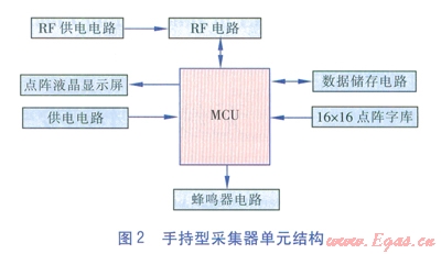 手持型采集器中MCU、供電電路、RF供電電路、RF電路、數(shù)據(jù)儲(chǔ)存電路的功能與無線遠(yuǎn)傳燃?xì)獗碇懈鲉卧墓δ芤恢隆F渌麊卧墓δ転椋狐c(diǎn)陣液晶顯示屏:負(fù)責(zé)顯示手持型采集器的工作信息及計(jì)量數(shù)據(jù);16×16點(diǎn)陣字庫:作為點(diǎn)陣液晶顯示屏的字庫;蜂嗚器電路:為手持型采集器蜂鳴器提供電力,保證蜂嗚器正常工作。