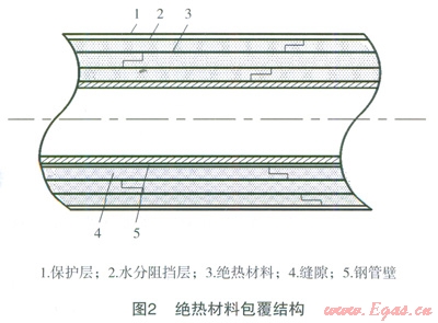 LNG槽車(chē)到站后,通常通過(guò)低溫泵法或增壓器法對(duì)槽車(chē)內(nèi)LNG增壓后將LNG卸入儲(chǔ)罐內(nèi)。不論采用哪種方法,LNG必須通過(guò)低溫管道進(jìn)行輸送,在輸送過(guò)程中,LNG將吸收外界環(huán)境熱量而氣化,產(chǎn)生BOG。為了減少BOG的產(chǎn)生,通常利用兩種方法對(duì)低溫管道進(jìn)行保冷處理,即絕熱材料包覆法和真空管法,這兩種方法結(jié)構(gòu)如圖2、3所示[5]。