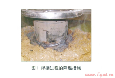 在焊接Fitting過程中,溫度監(jiān)控及降溫措施尤為重要。焊接時,在焊縫周邊至少連接4個感應(yīng)器對溫度進行測量監(jiān)控,并進行相應(yīng)的降溫措施,比如覆蓋含水量適中的粘土或液體冷卻袋于焊接處周邊,有效阻止降低焊接溫度在母管上的傳導(dǎo)。運用不同廠家生產(chǎn)的內(nèi)襯材料,感應(yīng)器與焊縫間、降溫物質(zhì)與焊縫間的距離設(shè)置各不相同,通過溫度感應(yīng)器測量得到的最高允許溫度值也不同。