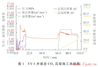 YY-1井井深l600m,長(zhǎng)7段巖性為黑色頁(yè)巖,厚度65m,錄井氣測(cè)異常,具有較好的試氣價(jià)值。2012年4月,采用液態(tài)CO2壓裂工藝對(duì)該井長(zhǎng)7段頁(yè)巖氣層進(jìn)行壓裂,有明顯破壓顯示,施工壓力平穩(wěn)(圖1),施工順利。關(guān)井24h后開(kāi)井放噴排液,24h后點(diǎn)火可燃。