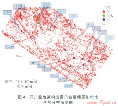 預(yù)測得到的含氣分布如圖4所示,紅色為含氣。該區(qū)4口純產(chǎn)氣井,3口井位于或緊鄰低泊松比部位(紅色),1口井位于不含氣部位,5口純產(chǎn)水井均位于不含氣的部位,3口氣水同產(chǎn)井都位于或靠近含氣部位,4口干井有2口井位于不含氣部位??傮w看,l6口井3口井不符合(符合率為81%)。
