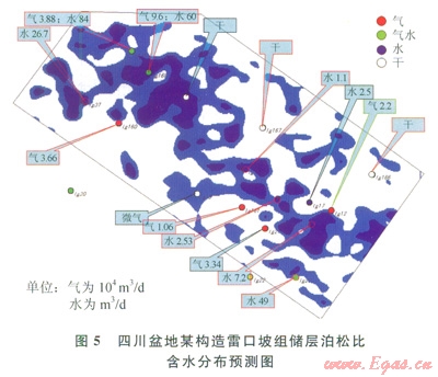 圖5為預(yù)測的含水分布預(yù)測圖。圖5中,5口純產(chǎn)氣井和3口氣水同產(chǎn)井有7口位于預(yù)測的含氣分布區(qū),有l口井不符合,4口純產(chǎn)氣井均不在預(yù)測的含水部位,4口干井有2口處于預(yù)測的含水部位。16口井有3口井不符合(符合率為81%)。