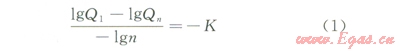 式中Q1為序號(hào)為1的氣藏的儲(chǔ)量規(guī)模,也即最大氣藏規(guī)模,l08m3;Qn為序號(hào)為挖的氣藏的儲(chǔ)量規(guī)模,108m3;K為氣藏規(guī)模的變化率,也即在雙對(duì)數(shù)坐標(biāo)上的斜率,無(wú)量綱;n為氣藏規(guī)模序列號(hào)。
