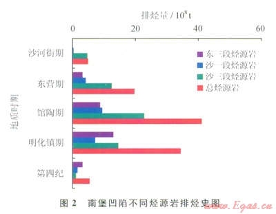 南堡凹陷3套烴源巖熱演化程度有所差異,因此不同烴源巖的主要排烴時(shí)期和排烴量也存在差異(圖2)。沙三段烴源巖發(fā)生大規(guī)模排烴的時(shí)間較早,在沙河街組沉積期就發(fā)牛一定規(guī)模的排烴過(guò)程,東營(yíng)組沉積期以來(lái)發(fā)生了大規(guī)模的排烴過(guò)程;沙一段和東三段烴源巖發(fā)生大規(guī)模排烴的時(shí)間較晚,其大規(guī)模排烴的時(shí)間主要集中在館陶組沉積期以來(lái)??偟膩?lái)說(shuō)東營(yíng)期、館陶期和明化鎮(zhèn)期是主要的排烴期,且3套烴源巖均只有1次排烴高峰期,說(shuō)明南堡凹陷只有1次主要成藏期。且至今仍在成藏過(guò)程中,這和前人利用烴類流體包裹體均一化溫度分析結(jié)果一致。南堡凹陷發(fā)生油氣充滓過(guò)程的時(shí)間跨度大,從東營(yíng)組沉積時(shí)期至第四系沉積時(shí)期均有油氣成藏[20]。