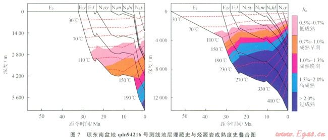 盆地的構(gòu)造沉降與埋藏史不同也導(dǎo)致成熱度演化軌跡的不同,快速的沉降與埋藏往往會對應(yīng)烴源巖的快速增熟和熱演化程度的升高。圖7為瓊東南盆地94216號測線的地層埋藏史與烴源巖成熟度史模擬疊合圖,2個人工井點分別位于凹陷邊緣與凹陷中央??梢钥闯觯貉鲁墙M存在2期快速沉降與Ⅰ期緩慢沉降階段,同時對應(yīng)2期烴源巖的快速增熟與Ⅰ期緩慢增熟過程。早期的快速沉降發(fā)生在32.0~23.3Ma為盆地裂陷期快速拉張階段,此階段雖然發(fā)生了烴源巖的快速增熟,但凹陷邊緣烴源巖的熱演化程度尚很低,剛剛或尚未進入生油窗,凹陷中央早期演化樣度偏低,但晚期可進入生氣窗;第2期的快速沉降發(fā)生于5.4Ma以來,盆地受紅河斷裂帶構(gòu)造體制轉(zhuǎn)換的影響加速沉降,沉積了巨厚的鶯歌海組,導(dǎo)致崖城組烴源巖熱演化程度迅速增高,達到高成熟過成熟階段。