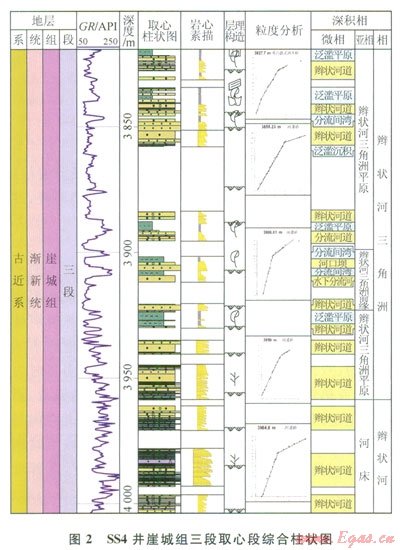 與同處于南海北部的珠江口盆地不同,瓊東南盆地缺少類似古珠江流域這樣的大河來為盆地提供巨厚的沉積物,因此,盆地內(nèi)物源相對不充分,較明顯的為來自盆地西北部的三亞河和東北部的萬泉河,帶來了一定的物源供給,形成了相對較厚的三角洲沉積。以鉆遇三亞河三角洲的SS4井為例(圖2,圖3-a、3-b),該井主要為灰白色、淺灰色礫巖、砂礫巖、粗砂巖、中砂巖夾薄層灰色碳質(zhì)泥巖,礫巖呈次棱角狀—次圓狀,分選差—中等,礫石直徑可達4cm,多次見沖刷面與滯留沉積,正韻律發(fā)育,沉積現(xiàn)象豐富(如槽狀交錯層理、平行層理、波狀層理、變形層理、生物擾動構(gòu)造、見炭化的植物莖),總體為辮狀河三角洲平原至前緣的沉積。砂巖粒度概率曲線有三段式與兩段式2種,分別代表了辮狀河道與水下分流河道沉積。顯微鏡下看以中粒長石石英砂巖、粗粒長石巖屑砂巖、長石雜砂巖等為主,富含云母、長石等不穩(wěn)定礦物,成熟度較低,反映較近源沉積環(huán)境。GR測井曲線上,下部表現(xiàn)為齒化鐘形,上部表現(xiàn)為大幅度微齒化箱形、鐘形、漏斗形,且以箱形為主,反映下部水動力頻繁活動。上部相對較穩(wěn)定。測井解釋煤層8層,總厚度為3.56m,主要的成煤環(huán)境為辮狀河三角洲平原。該井崖三段早期植物角質(zhì)豐度大,指示陸相環(huán)境,而晚期有孔蟲、海相溝鞭藻呈不連續(xù)但高濃度分布,表明該部位受到海侵影響。