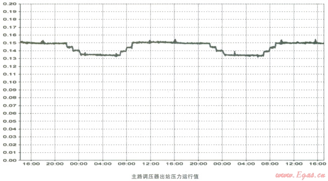 (3)壓力自動跟蹤功能減輕調(diào)度中心日常調(diào)壓的工作量。當(dāng)在較長一個時期,每天的壓力調(diào)整基本相同的情況下無須調(diào)度中心每時段去調(diào)整,只需將各時段所需調(diào)整的壓力參數(shù)下載到PLC,設(shè)備即可自動按預(yù)設(shè)曲線運行。每天不同時段合理設(shè)定壓力,使調(diào)壓站的供氣量在設(shè)備運行工況較好的量程范圍內(nèi),延長設(shè)備的使用壽命。