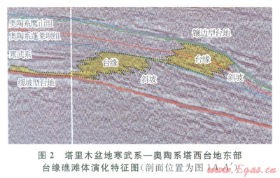 地震資料揭示了塔里木盆地塔西臺地寒武奧陶紀(jì)碳酸鹽巖臺地臺緣礁灘的演化過程(圖2)。塔西臺地東部在早寒武世早期表現(xiàn)為碳酸鹽緩坡[3],并在早寒武世中期(肖爾布拉克組沉積期)過渡為鑲邊臺地。早寒武世中期—晚寒武世,臺緣帶以加積—進積的方式生長,厚度超過l500m,進積距離在塔中—古城地區(qū)最大,可達80km。寒武紀(jì)末,海平面下降造成臺地暴露,結(jié)束了臺地生長過程,臺緣帶頂部見有明顯的削截現(xiàn)象。奧陶紀(jì),隨著海平面的再次上升,逐漸形成了第二個生命周期的碳酸鹽巖臺地建造。奧陶紀(jì)塔西臺地東緣主要以加積的方式生長,臺緣礁灘的厚度超過1200。