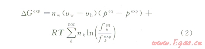 式中Du為過飽和度,J;DGexp為吉布斯自由能的變化量;pep為相平衡壓力,MPa;pexp為實驗條件下的壓力,MPa;R為氣體常數(shù),kJ/(mol·K);T為系統(tǒng)溫度,K;k為波爾茲曼常數(shù);nw為水合數(shù);uw為水分子的體積,m3;uh為單個水合物晶胞的體積與平衡壓力下所含有的氣體分子數(shù)的比值,m3;nk為氣體分子的數(shù)量;¦keq為相平衡條件下k組分氣體的逸度系數(shù);¦kexp為實驗條件下k組分氣體的逸度系數(shù);jeq為相平衡條件下氣體的逸度系數(shù);jexp為實驗條件下氣體的逸度系數(shù)。