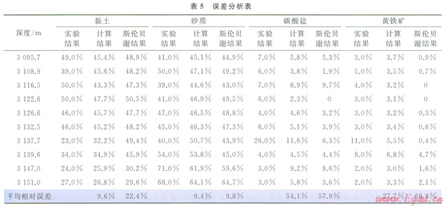 表5是對幾種主要礦物含量計(jì)算結(jié)果的誤差分析。從表5中可以看出,對于含量大于20%的黏土和砂質(zhì),筆者計(jì)算的礦物含量的平均相對誤差分別為9.6%和9.4%,均小于10%。雖然碳酸鹽和黃鐵礦的平均相對誤差較大,但由于這兩種礦物含量較少,這樣的結(jié)果也是可以接受的。與斯倫貝謝Spectrolith模型計(jì)算的結(jié)果相比,筆者計(jì)算的4種礦物的平均相對誤差均小于斯倫貝謝計(jì)算結(jié)果。