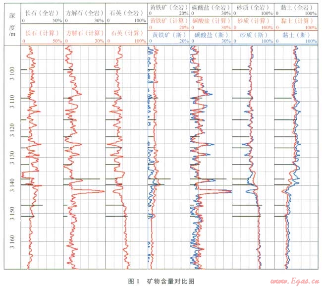 碳組分碳酸鹽則由鈣組分的測量中精準(zhǔn)地獲得,石膏鹽則由Ca和S的測量來確定,地層中的剩余組分則為QFM(石英+長石+云母)[7-8]。從圖1中可以看出,筆者計(jì)算得到的砂質(zhì)與斯倫貝謝計(jì)算的砂質(zhì)吻合的非常好,變化趨勢基本一致;黏土和碳酸鹽吻合較好,整體變化趨勢一致;而黃鐵礦吻合效果較差,但筆者計(jì)算的結(jié)果與全巖分析的吻合效果優(yōu)于斯倫貝謝與全巖分析的吻合結(jié)果。