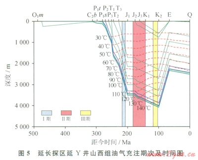 山西組砂巖中流體包裹體的測溫結(jié)果表明:①延長地區(qū)上古生界山西組至少存在3期流體活動,第Ⅰ期流體活動的主峰溫度在85~90℃,規(guī)模較?。坏?span lang="EN-US">Ⅱ期流體活動的主峰溫度在115~120℃,這期流體形成了大量石英加大邊;第Ⅲ期流體活動的主峰溫度在135~155℃,流體規(guī)模較大。②高于l65℃的樣品點34個,溫度范圍較分散。③從測點數(shù)日來看,110~165℃區(qū)間內(nèi)的數(shù)據(jù)點較多,共計482個。在3期流體活動中均檢測到含烴包裹體,因此推測其與油氣充注有關(guān)。將流體包裹體的均一溫度投影在單井埋藏史圖上(圖5),發(fā)現(xiàn)3期油氣充注分別發(fā)生在晚三疊世、中晚侏羅世和早白堊世。