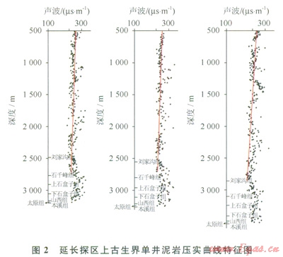 該區(qū)上古生界發(fā)育2套區(qū)域性蓋層:①下二疊統(tǒng)太原組海相石灰?guī)r,厚度介于15~45m,分布穩(wěn)定,也是本溪組的直接蓋層;②上石盒子組與石干峰組發(fā)育的泥質(zhì)巖系,厚度介于l50~350m,分布穩(wěn)定,橫向連續(xù),是山西組~下石盒子組氣藏的重要蓋層。對該區(qū)上古生界泥巖的壓實研究表明,聲波時差明顯高于正常壓實趨勢(圖2),表明上古生界普遍存在古超壓現(xiàn)象[11-13],其過剩壓力介于5~20MPa,最大過剩壓力出現(xiàn)在上石盒子組—石千峰組,組成上古生界壓力封存箱的箱頂,天然氣很難突破箱頂超壓體而在箱內(nèi)成藏[14-15]。前人的研究也表明[16-19],鄂爾多斯盆地上古生界匕石盒子組與石干峰組泥巖封蓋性能優(yōu)越,具有物性封閉和壓力封閉雙重封閉特征。