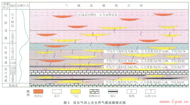 1)延長探區(qū)處于鄂爾多斯盆地東南部,與盆地北部一樣,具有“廣覆式生烴、大面積成藏”的特點。本溪組—山2段暗色泥巖與煤系地層是主力生烴層系;儲層砂體發(fā)育,多層系砂體垂向疊置橫向連片,加上構(gòu)造不發(fā)育,是形成大面積復(fù)合巖性圈閉的重要條件;上石盒子—石千峰組發(fā)育巨厚的泥巖具有物性和壓力雙重封閉性能;砂體與裂縫是主要輸導(dǎo)體系,天然氣運移以垂向運移為主。