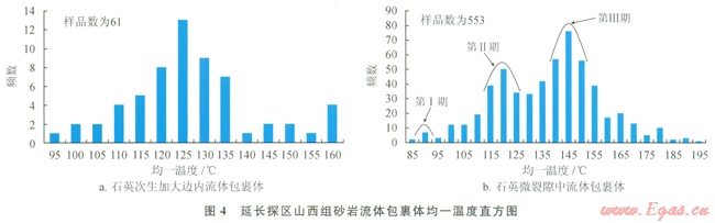 流體包裹體分析是研究油氣運移充注期次的有效手段。選取山西組22個砂巖樣品進行流體包裹體分析,根據(jù)鏡下觀察結(jié)果,流體包裹體主要分布在石英次生加大邊及石英顆粒微裂隙,其中砂巖石英次生加大邊內(nèi)流體包裹體均一溫度(圖4-a)分布在94.2~159.3℃,主峰溫度區(qū)間位于115~135℃;砂巖石英微裂隙中流體包裹體均一溫度(圖4-b)分布在82.7~193.8℃,并分為3個溫度區(qū)間,分別是80~95℃、95~130℃、l30~195℃,主峰溫度區(qū)間位于85~90℃、ll0~125℃和l35~155℃。石英加大邊內(nèi)流體包裹體的均一溫度主峰區(qū)間與石英裂縫中的第Ⅱ期流體包裹體均一溫度的主峰溫度區(qū)間相近,應(yīng)該屬于同一期酸性流體活動。