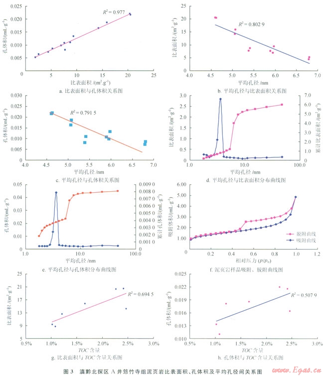 對滇黔北A井筇竹寺組泥頁巖樣品進(jìn)行了比表面積測量和孔徑在1.5~300.0nm樣品的孔體積測試,得出筇竹寺組頁巖氣儲層的比表面積為1.915~7.691m2/g.平均為5.185m2/g;孔體積為0.0051~0.0108mL/g,平均為0.0080mL/g;平均孔徑為5.38~10.85nm。反映筇竹寺組泥頁巖的比表面積和孔體積均較大。有利于頁巖氣的吸附。從中也可以看出,其孔比表而積與孔體積二者之間具有較好的正相關(guān)性,即隨著比表面積的增大??左w積也隨之增大(圖3-a、3-b)。與之相反。比表面積、孔體積與平均孔徑則呈負(fù)相關(guān)性。即比表面積、孔體積均隨孔徑的增大而減小(圖3-c、3-d).且當(dāng)孔徑小于10nm時(shí),孔體積分布曲線很陡,而當(dāng)孔徑大于等于10nm時(shí),曲線則逐漸變得平緩,說明孔徑范圍在1~8nm內(nèi)的孔隙對泥頁巖比表而積、孔體積值的貢獻(xiàn)最大(圖3-c),即小孔隙越發(fā)育,頁巖的比表面積、孔體積越大,越有利于泥頁巖對頁巖氣的吸附聚集。