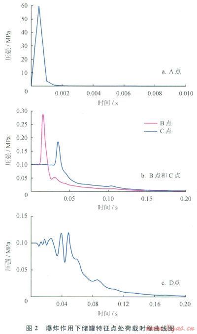 儲罐各特征點處在爆炸作用下的荷載時程曲線如圖2所示,由于E、F兩點距離爆心較遠,其超壓現(xiàn)象不明顯,本文并未示出這兩點的相應(yīng)曲線。比較前3個特征點的荷載時程曲線,其極值分別為59.15MPa、0.28MPa和0.18MPa;峰值出現(xiàn)時間分別為0.5ms、15.1ms和35ms;正壓區(qū)作用時間分別為2ms、8ms和10.5ms。本文參考文獻[14]中給出了裝藥密度為1630kg/m3時TNT炸藥所形成空氣沖擊波的初始值,其初始波后壓力為54.35MPa,傳播速度為6450m/s.