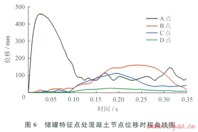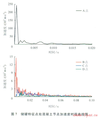 圖7為儲罐特征點A~D處混凝土節(jié)點加速度時程曲線。由圖7可見,各點加速度峰值均出現(xiàn)在初始加載階段,而后反應(yīng)大幅下降,并伴有鋸齒形劇烈振蕩,振蕩現(xiàn)象隨著爆心距的增加而愈加劇烈。這一現(xiàn)象的原因為炸藥爆炸后給儲罐穹頂一個極大的初始加速度荷載,引起各特征點處加速度出現(xiàn)一個脈沖峰值,而后出現(xiàn)的鋸齒形振蕩則是由儲罐的自振引起的。將圖5~7與圖2的荷載時程曲線相對比,叮以看出,沖擊波波陣面的傳播對混凝土單元的應(yīng)力影響很大,但對于其加速度響應(yīng)影響不大。以C點為例,其荷載峰值出現(xiàn)在35ms處,此時其相應(yīng)的應(yīng)力出現(xiàn)了一個脈沖峰值,而其加速度響應(yīng)未有明顯波動。