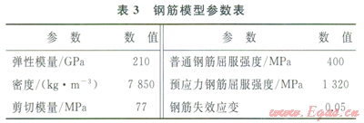 混凝土采用Johnson-Holmquit本構(gòu)模型,模型參數(shù)見表2。該模型因綜合考慮了損傷、應(yīng)變率、靜水壓以及壓碎、壓實效應(yīng),適合大應(yīng)變、高應(yīng)變率和高靜水壓情況,被廣泛地應(yīng)用于混凝土撞擊、侵徹和爆炸等強動載問題的數(shù)值模擬。鋼筋材料模型采用雙線性隨動硬化模型,用兩個斜率(彈性和塑性)來表示鋼筋的應(yīng)力應(yīng)變特性,具體參數(shù)見表3。