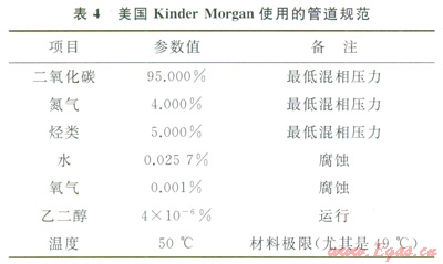 日前運(yùn)行的管道中所輸送的CO2混合物及對純度和含水量的規(guī)定等都不盡相同。國際上對于管道系統(tǒng)輸送CO2混合氣體的組成要求沒有統(tǒng)一的標(biāo)準(zhǔn)?;旌蠚怏w的組成要求很大程度上取決于設(shè)計(jì)階段進(jìn)行的評估,包括流動安全、管道完整性、安全性及終端用戶對CO2純度的需求。美國Kinder Morgan使用的管道規(guī)范見表4[12]。