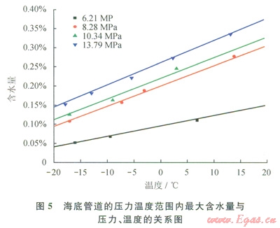 2)雜質(zhì)的存在會對CO2輸送管道的安全運(yùn)行產(chǎn)生極大的影響,特別是游離水的出現(xiàn)。當(dāng)輸送過程中含水量超過水的溶解度極限時(shí),管內(nèi)會析出游離水,游離水的出現(xiàn)會對CO2輸送管道的設(shè)計(jì)操作、腐蝕及CO2水合物生成產(chǎn)生負(fù)面影響,因此,需要設(shè)定CO2輸送管道最大允許含水量的規(guī)范。