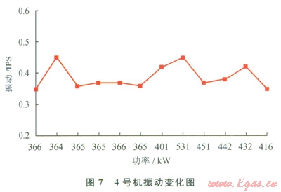 在10口井的試驗(yàn)中,GTI混合燃料技術(shù)基本能滿足各個(gè)工況下鉆機(jī)對(duì)柴油機(jī)動(dòng)力的需求,對(duì)突加負(fù)荷的滿足能力較強(qiáng),當(dāng)運(yùn)行參數(shù)超過設(shè)定的安全值,能立即平穩(wěn)地轉(zhuǎn)為純柴油模式,保證動(dòng)力供給的連續(xù)性。起下鉆工況下,4號(hào)柴油機(jī)最低排溫511℃,最高排溫576℃,均在安全范圍內(nèi)。其排溫曲線和振動(dòng)變化如圖6、7所示。