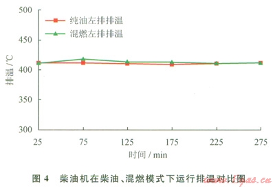 柴油機(jī)組在混合燃料狀態(tài)運(yùn)行時(shí),機(jī)組運(yùn)行的各項(xiàng)參數(shù)與柴油機(jī)標(biāo)定參數(shù)相近,在啟動(dòng)、關(guān)閉等過程,發(fā)動(dòng)機(jī)運(yùn)行平穩(wěn),無異常。當(dāng)負(fù)荷過低時(shí),機(jī)組混燃模式下的排溫略高于純柴油模式,但仍在安全范圍以內(nèi),不對(duì)柴油機(jī)組的運(yùn)行造成影響。