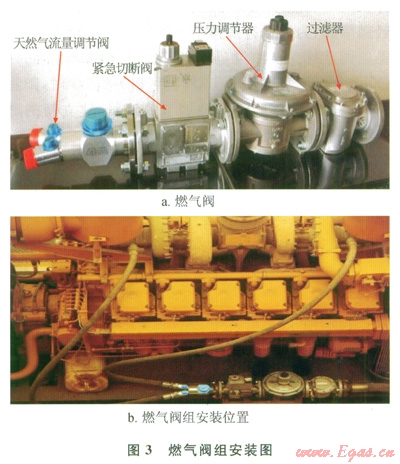由天然氣流量調(diào)節(jié)閥、緊急切斷閥、壓力凋肯器和過濾器組成(圖3)。過濾器用于濾除天然氣中的污染物以保護(hù)系統(tǒng)和柴油機(jī);壓力調(diào)節(jié)器可以監(jiān)測柴油機(jī)負(fù)載增減引起的柴油機(jī)真空度變化,從而保持設(shè)定的天然氣進(jìn)氣壓力。緊急切斷閥內(nèi)部包含2個(gè)相互獨(dú)立的“常閉”狀態(tài)的閥門。天然氣流量調(diào)節(jié)閥用于控制給定負(fù)載時(shí)的天然氣流量,可用于設(shè)定天然氣/柴油替代率。