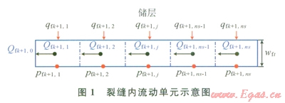 假設(shè)流體經(jīng)過裂縫面進(jìn)入裂縫后向水平井筒的流動(dòng)為一維線性流動(dòng)(圖1)。為了便于計(jì)算,將微元段處理成矩形進(jìn)行汁算,裂縫寬度為wfk+1,以計(jì)算流體在裂縫中流動(dòng)時(shí)產(chǎn)生的壓力降落。