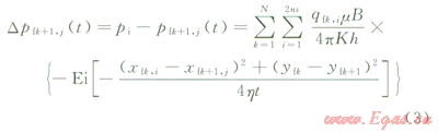 式(4)就是所有裂縫線匯單元同時(shí)生產(chǎn)時(shí)間t后在O點(diǎn)產(chǎn)生的壓力降落響應(yīng)方程。