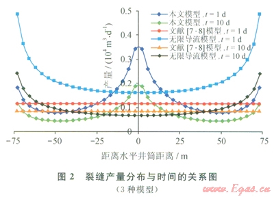 圖2是3種模型第l條裂縫的產(chǎn)量分布對(duì)比結(jié)果。采用無限導(dǎo)流模型計(jì)算結(jié)果表明,由于沒有考慮裂縫內(nèi)的壓力降落,在生產(chǎn)初期(t=ld)裂縫內(nèi)的產(chǎn)量分布為“U”形,裂縫兩端產(chǎn)量相對(duì)較高,這與本文參考文獻(xiàn)[15]規(guī)律一致;本文模型考慮了裂縫產(chǎn)量非均勻分布以及裂縫內(nèi)的壓力損失,裂縫產(chǎn)量在水平井筒附近出現(xiàn)局部峰值,且隨裂縫內(nèi)壓力損失增大,井筒附近裂縫產(chǎn)量的峰值越明顯,這是由于越靠近井簡(jiǎn)裂縫生產(chǎn)壓差越大,裂縫產(chǎn)量越高造成的;由于裂縫段內(nèi)相互干擾,隨著生產(chǎn)時(shí)間的增加,裂縫產(chǎn)量分布趨于均勻,但由于水平井筒壓力最低,裂縫上產(chǎn)量分布為近似“雙U”型,這與本文參考文獻(xiàn)[l4]規(guī)律相符合。