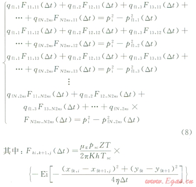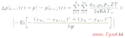 上面就完成了第一個(gè)Dt時(shí)間步長(zhǎng)下各線匯單元及總產(chǎn)量計(jì)算;對(duì)于各線匯單元而言,由于產(chǎn)量會(huì)隨生產(chǎn)時(shí)間發(fā)生變化,這樣就需要利用時(shí)間疊加來求得任意時(shí)刻的值。設(shè)時(shí)間段步長(zhǎng)為Dt,當(dāng)時(shí)t=mDt(第m個(gè)時(shí)間段的結(jié)尾),則對(duì)第k+1條裂縫的第j個(gè)線匯,可得到: